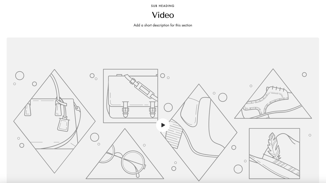 The "Video" section showcases engaging video content, helping to communicate the brand story, demonstrate products, or share tutorials. It captures attention, enriches user experience, and encourages deeper interaction with the content.